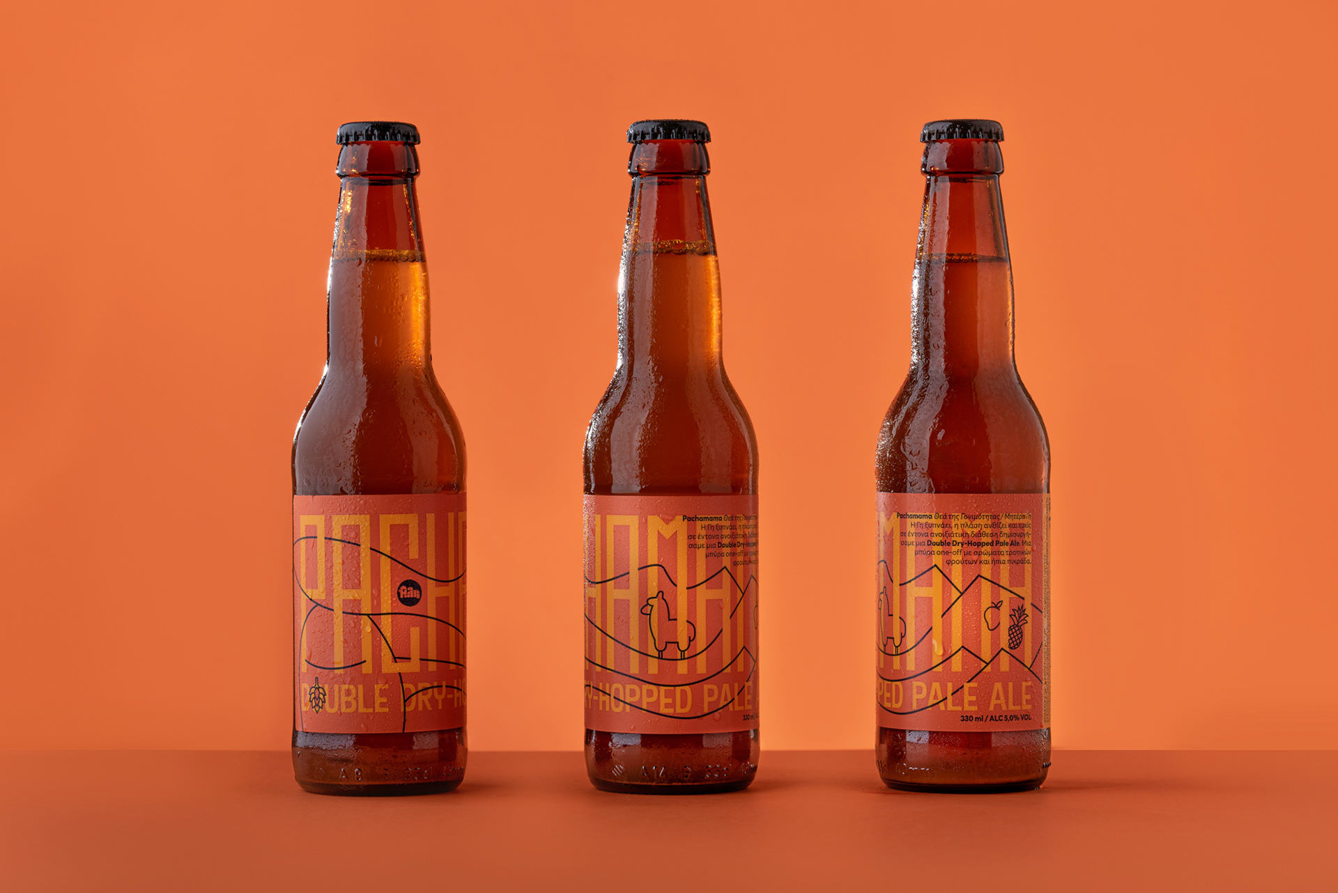 Pachamama is a new seasonal beer of Ali Microbrewery, from Thessaloniki which is a Double Dry-Hopped Pale Ale with aromas of tropical fruits and mild bitterness. Pachamama is still worshiped as the mother earth in parts of South America. The first references to this deity are found in the mythology of the Incas, who lived in the Andes. The main illustration of the label highlights the relationship of Pachamama with its places of worship, entangling the mountain range with the hair of the goddess. Additional iconographic elements, such as a lama, tropical fruits and hops, are references to the Andes and the taste of the beer. Our goal was for Pachamama-drinkers to gradually discover interesting elements by turning the bottle. By designing custom letters we wanted to emphasize the one-off character of the beer.